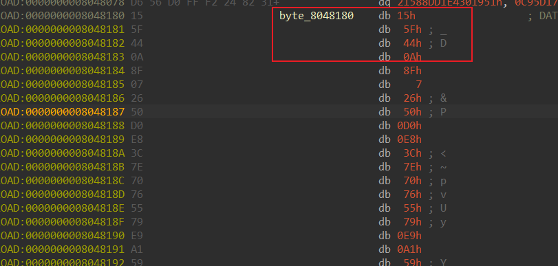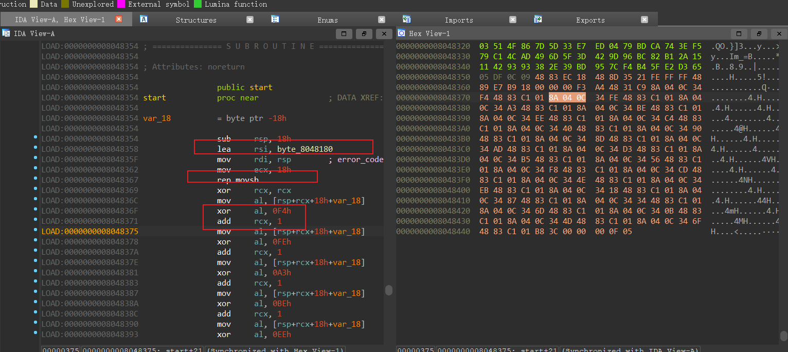 1 2 3 4 5 6 7 8 9 10 11 lea rsi, byte_8048180 mov rdi, rsp mov ecx, 18h rep movsb ;大致可以猜出来把byte_8048180 丢到了栈里 xor rcx, rcx ;清空了rcx,通过后面的add发现rcx是index mov al, [rsp+rcx+18h+var_18] xor al, 0F4h ;0xF4也就是xor的内容 add rcx, 1 mov al, [rsp+rcx+18h+var_18] xor al, 0FEh add rcx, 1