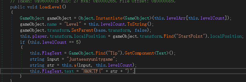 hnwana 下载下来发现是个unity游戏,打开一块尽然是Mono,直接dnspy。 在其中发现了一个奇奇怪怪的地方 读一下代码发现a需要传入那个字符串和5,于是我们原汤化原食,C#搓个脚本。