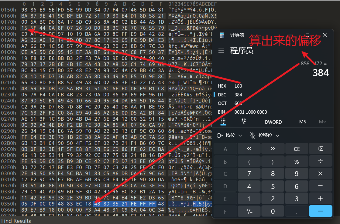 所以说我们思路就有了,也就是通过解析出文件xor al,后面的值,与最上面的lea rsi,的值进行异或。重点来了,此处我们如何提取呢,我这里使用了byte匹配的方式,因为xor,al此处的字节为0x43,所以我们直接提取一下。 所以构建出了exp的部分代码
