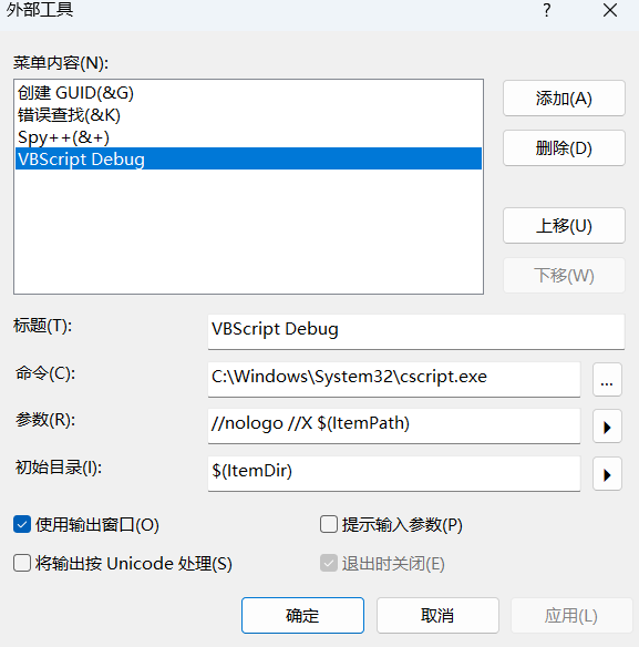 Tips: 如何使用VS2022调试VBS点击工具、外部工具: 按下面的设置添加,标题可以自己设置
