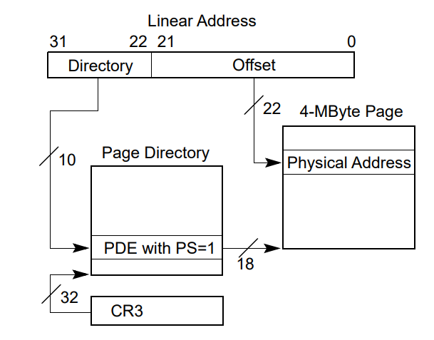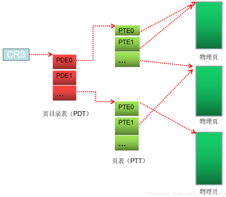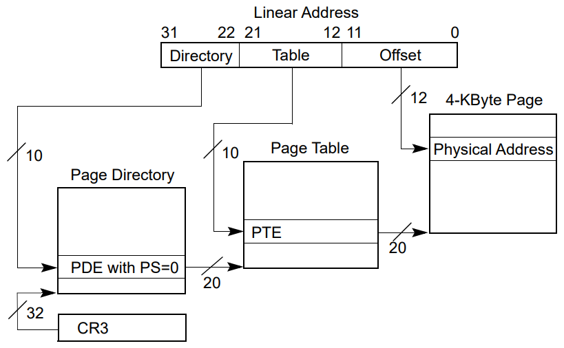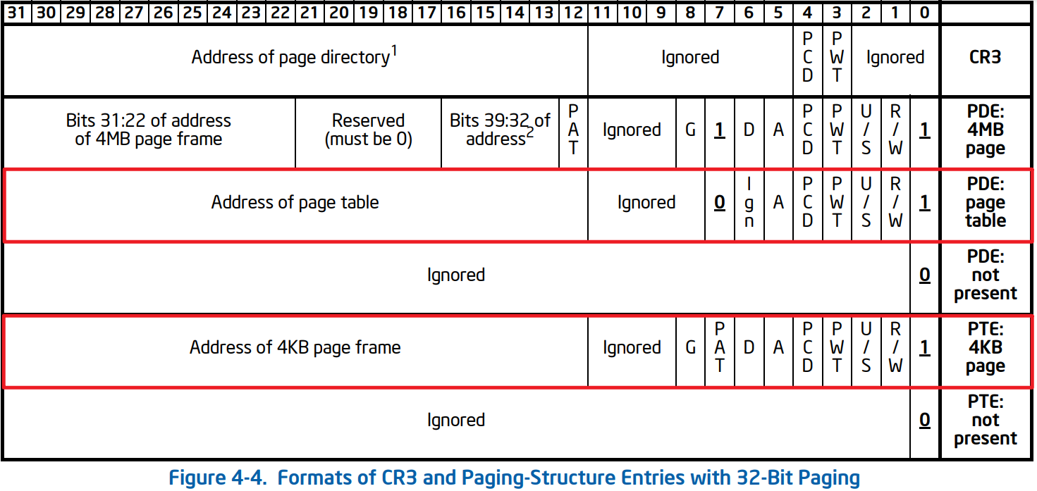 显然的,高10位为PDT偏移(获取PDE),中10位为PTT偏移(获取PTE),后12位为物理地址偏移。