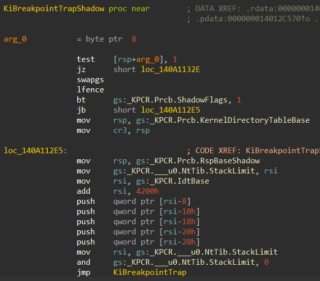 其中可以发现,使用swapgs先将gs指向_KPCR,然后判断是否开启了KPTI,如果开启了则使用内核的CR3给当前CR3寄存器,相当于把内核CR3给了当前CR3寄存器中,接着将rsp设置为内核栈。