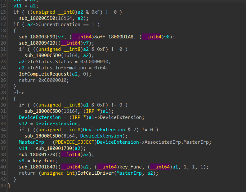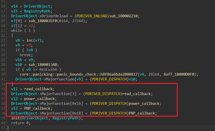 函数入口点可以发现只有IRP_MJ_READ、IRP_MJ_POWER、IRP_MJ_PNP是有点用的,其他的都是个那种默认的派遣函数回调。