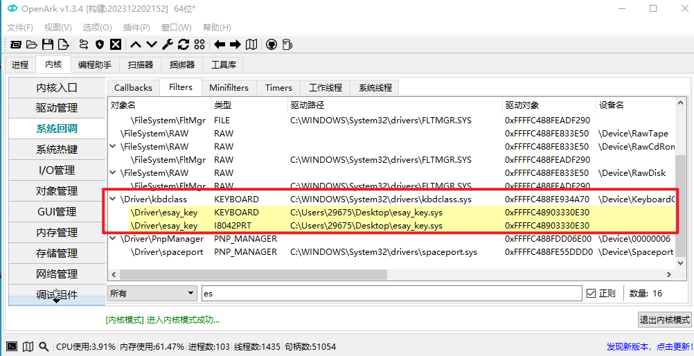加载进去后用ARK看看他都干了啥,结果发现是个键盘过滤驱动。