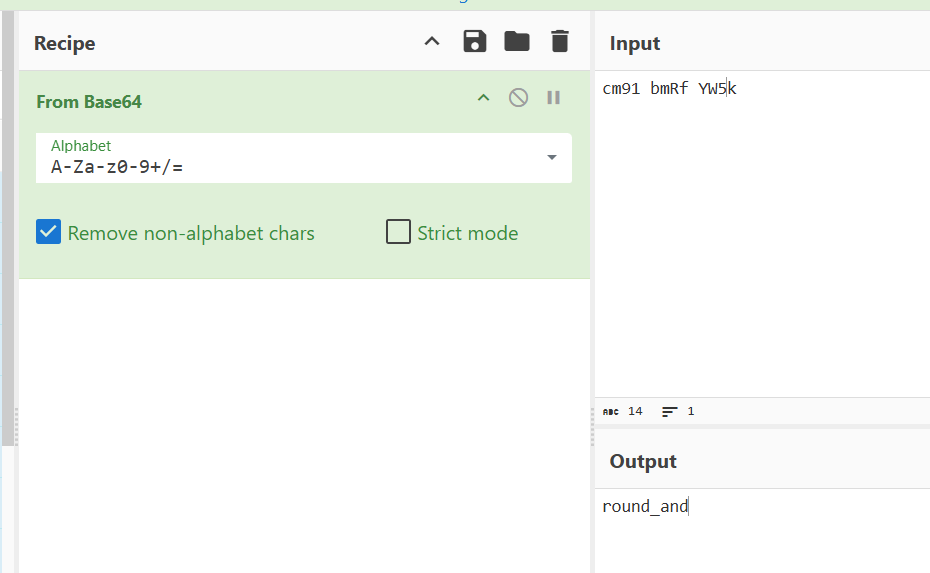两步,cyber解不了,去看一下b64,不过我没看出来,我直接试了一下,发现其每4个字符一组的中间2个字符会对调。