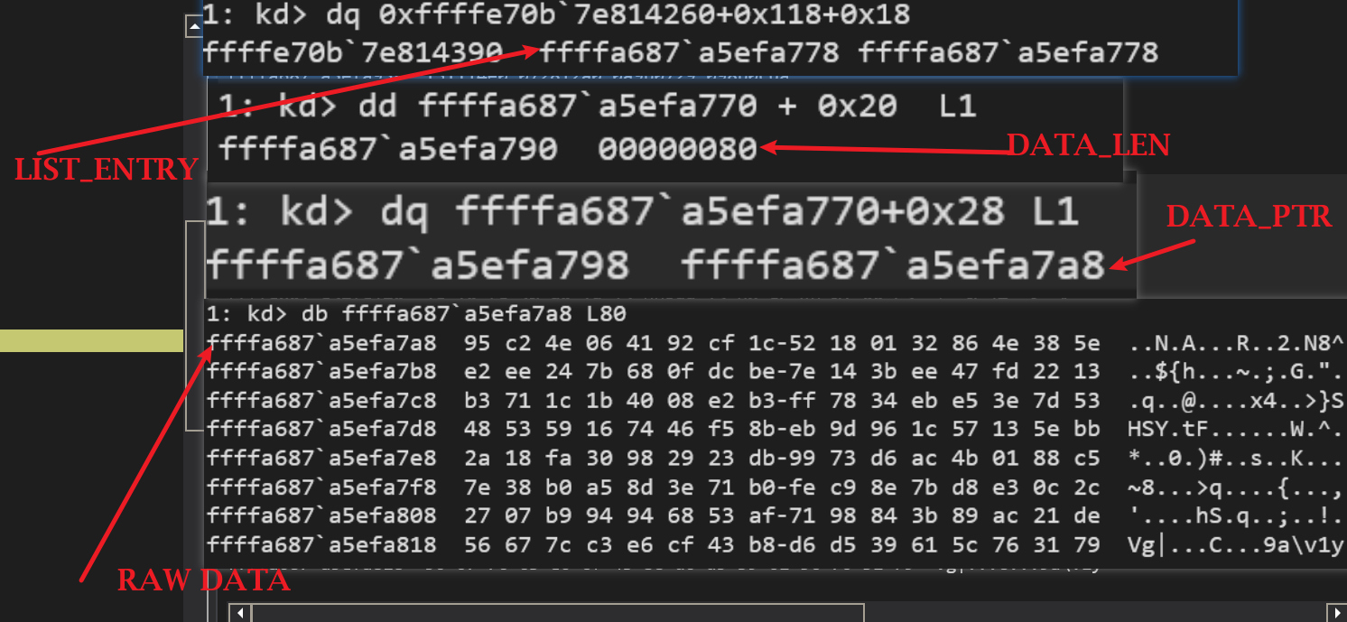 其中会发现在0x18处是其数据的LIST_ENTRY- 8则是原始数据结构的头部,+ 0x28则是数据指针,+ 0x20则是数据长度。