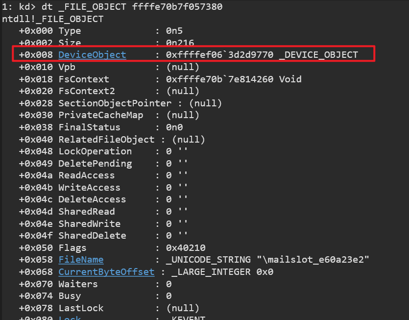 此时可以发现,_FILE_OBJECTFsContext成员为关键成员,其0x118处存储了数据。
