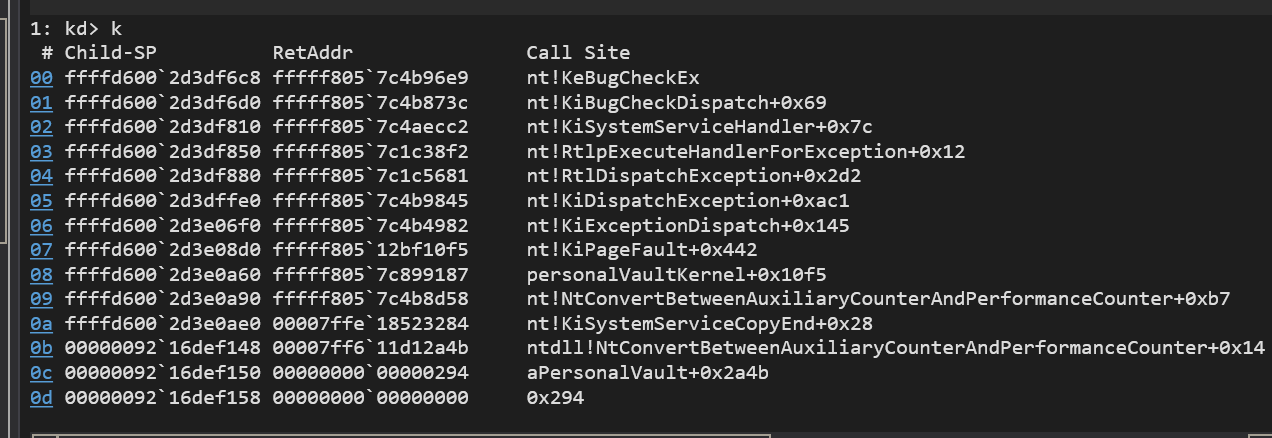 直接看一下堆栈情况,发现是一个从EXE 到 SYS中 并触发蓝屏的情况。